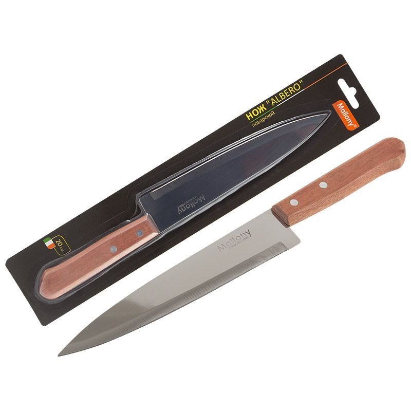 Нож с деревянной рукояткой ALBERO MAL-01AL поварской.Mallony.Нержавеющая сталь,дерево .Длина лезвия 20см.Толщина лезвия 1,2мм.Длина рукоятки 13 см(72)