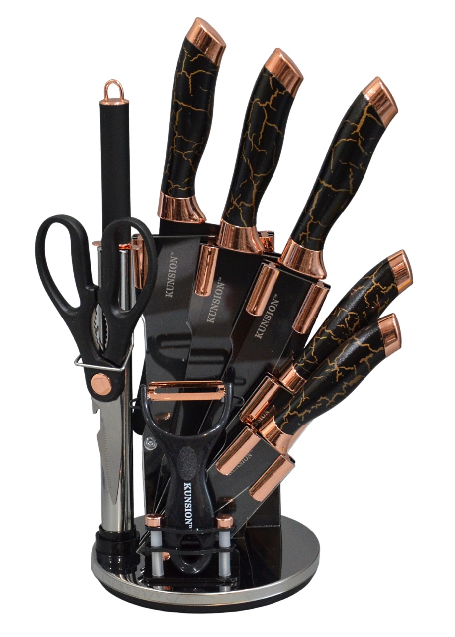 Набор ножей на подставке RM-1592 9 пр.В наборе 4 ножа,1 топор,1 ножницы,1 овощечистка,1 подставка.Нержавеющая сталь (12)