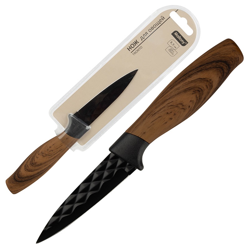 Длина лезвия 8,9см.Толщина стали 1,2мм.Пластиковая рукоятка "под дерево" с покрытием софт-тач.Нержавеющая сталь 2CR14, полипропилен (72/12)