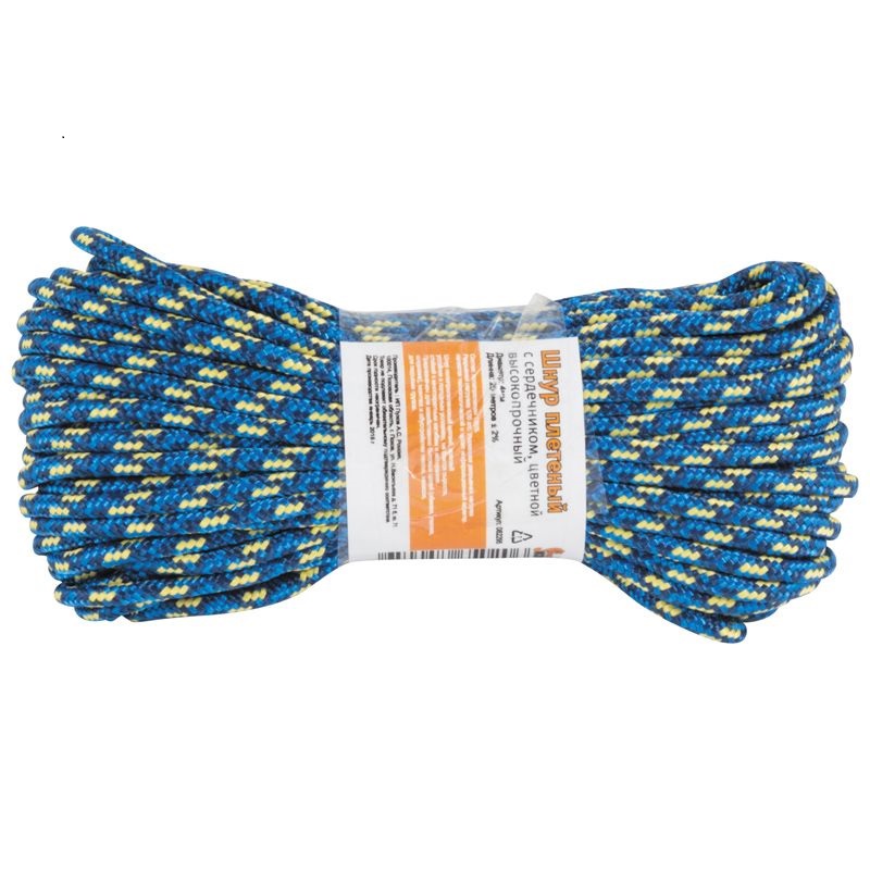 Шнур плетеный с сердечником высокопрочный цветной.Размер 20метров,диаметр 4мм.Шнур плетеный с сердечником высокопрочный цветной Состав цветной мультифиламентный полипропилен 100 %, 16 прядный, Размер: длинна в мотке 20 метров, д. 4 мм Разрывная нагрузка 100 кгс. Упаковка: цветной рукав Шнур применяется в домашнем хозяйстве и на даче, в походе и на рыбалке, используют в строительстве, для сооружения спортивного инвентаря, для упаковки различных товаров, мелких и среднегабаритных грузов, для оснащения маломерных судов. Шнур сохраняет прочность в течении большого периода времени, не боится сырости, имеет положительную плавучесть