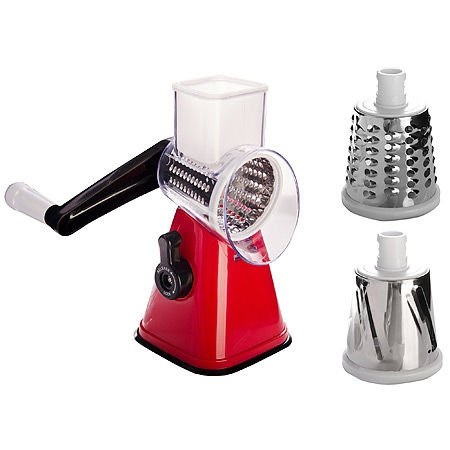 Терка-овощерезка RM-627/1 Красная.Материал нержавеющая сталь,пластик.3 насадки,диаметр каждой 6,5см.С помощью присоски она крепко устанавливается на любую рабочую поверхность стола или столешницы