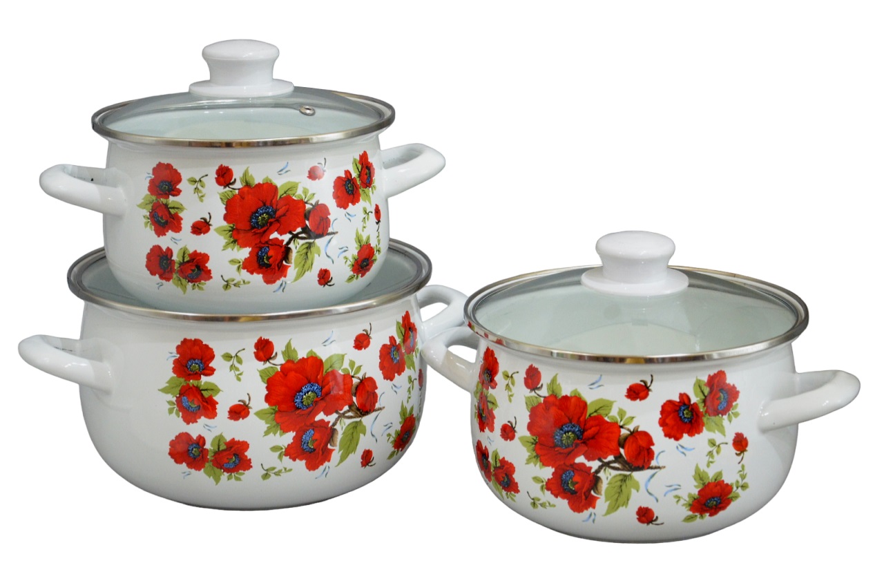 Набор кастрюль эмаль RM-1868/1 "Маки" 6пр.Объем 1,8л,2,8л,3,8л.Диаметр 18см,20см,22см (6)