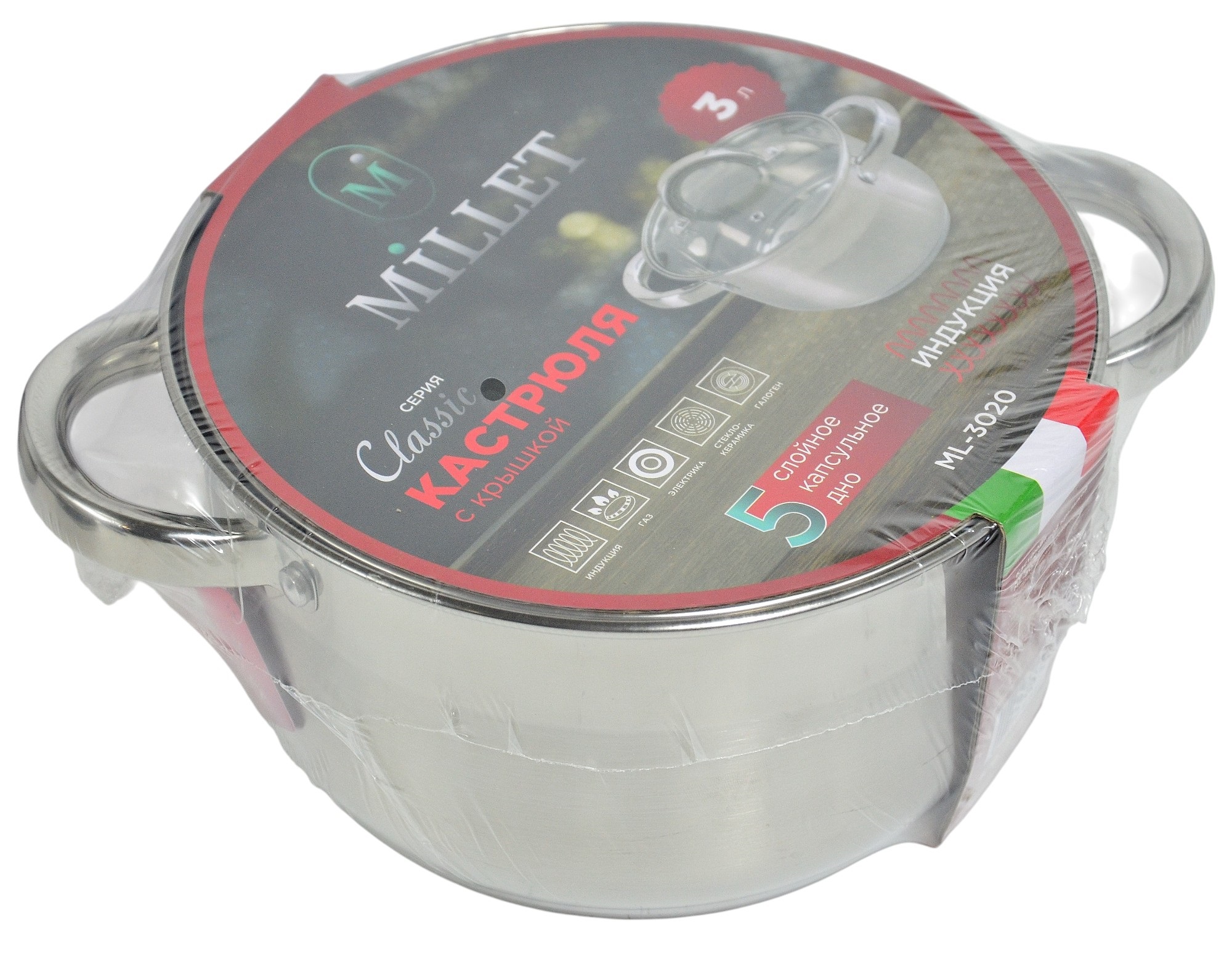 Индукция.Объем 3л.Размер 20*11,5см.Высококачественная нержавеющая сталь.Упаковка - цветной картонный вкладыш, термоусадка (крышка в перевернутом виде внутрь кастрюли) (6)