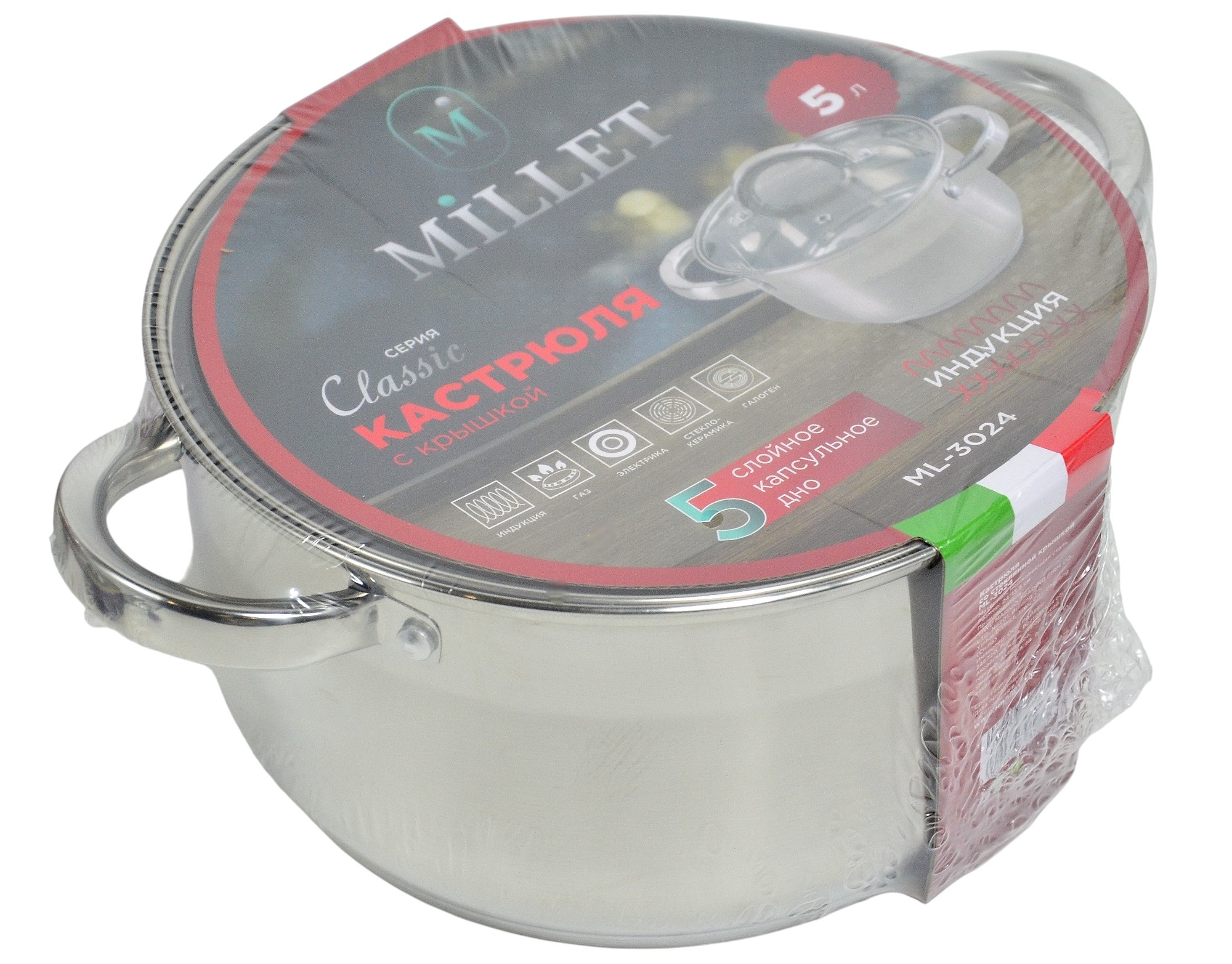 Индукция.Объем 5л.Размер 24*13,5см.Высококачественная нержавеющая сталь.Упаковка - цветной картонный вкладыш, термоусадка (крышка в перевернутом виде внутрь кастрюли) (6)