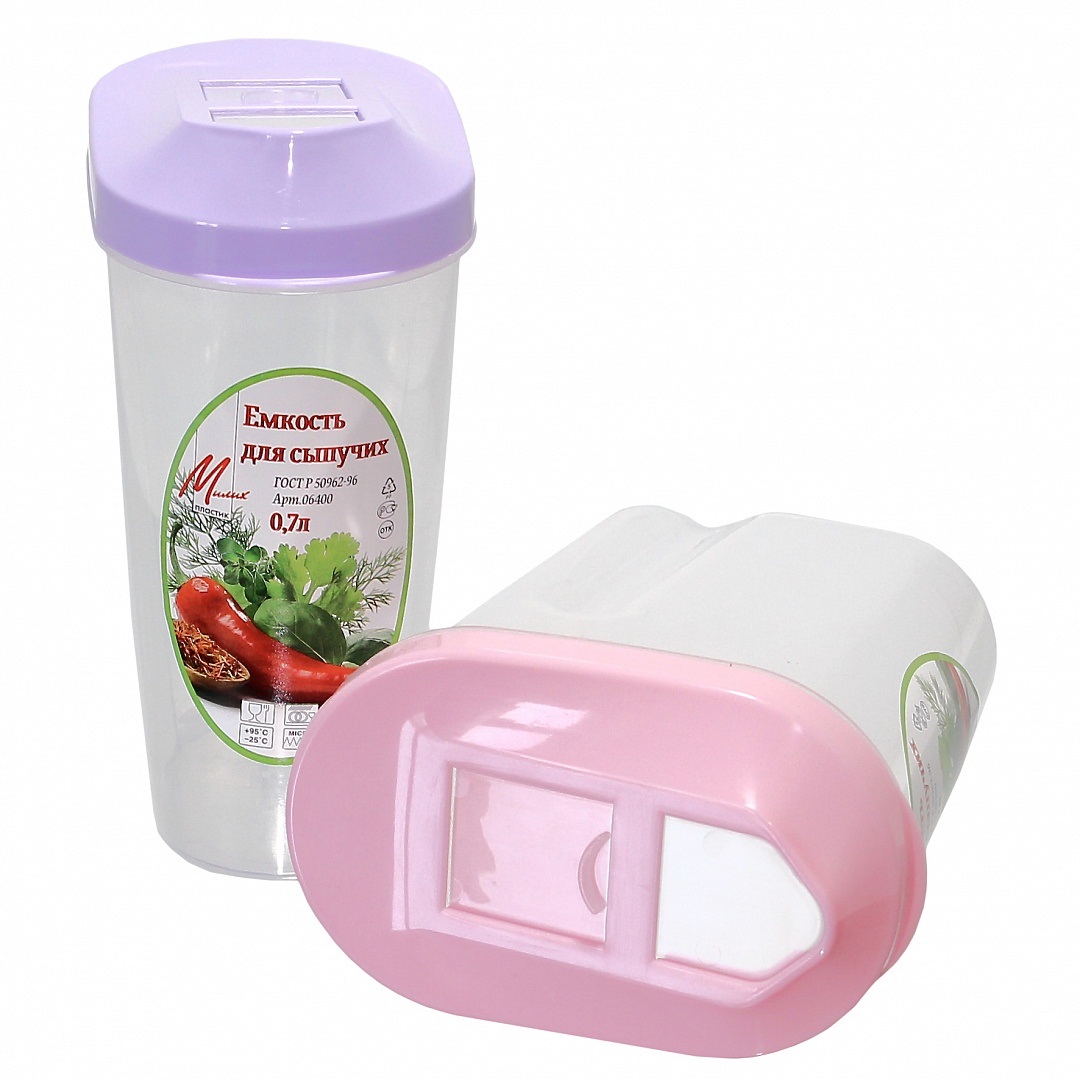 Емкость для сыпучих продуктов 06400.Объем 0,7л.Высота 15см,размер 7,5*12,5см.Пластик.В ассортименте (45)