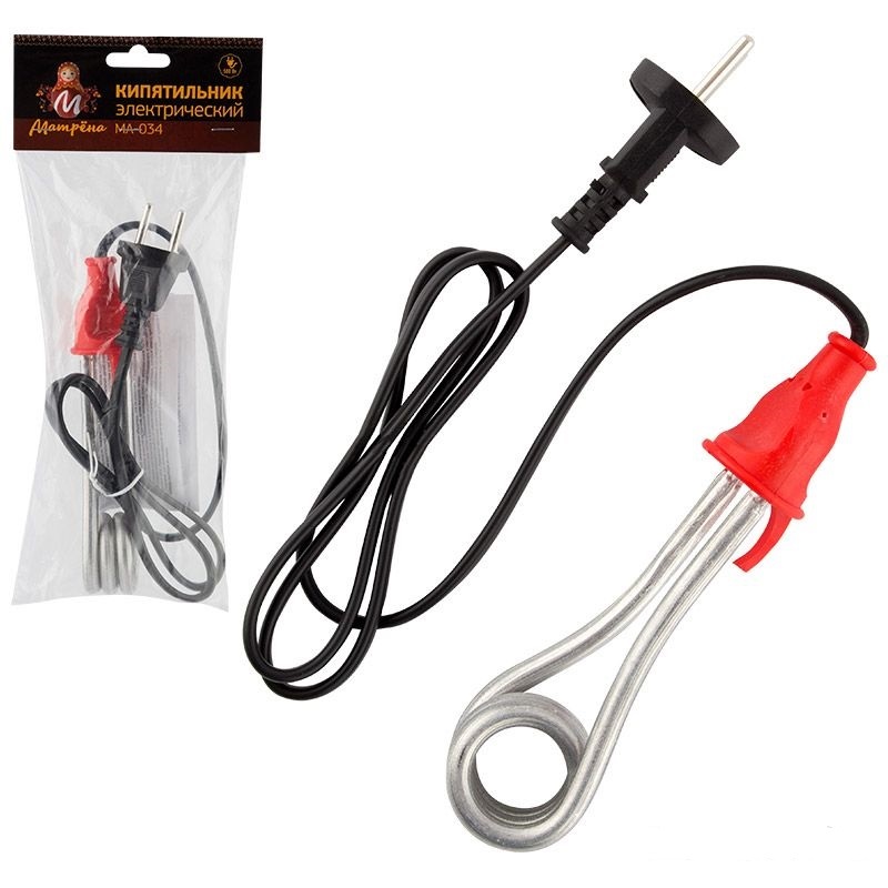 Кипятильник электрический Матрёна МА-034.Мощность 0,5 кВт Длина нагревательного элемента 10см.Диаметр нагревательного элемента 6,8мм.Алюминиевый ТЭН.Длина шнура 85см.Пакет с подвесом.
