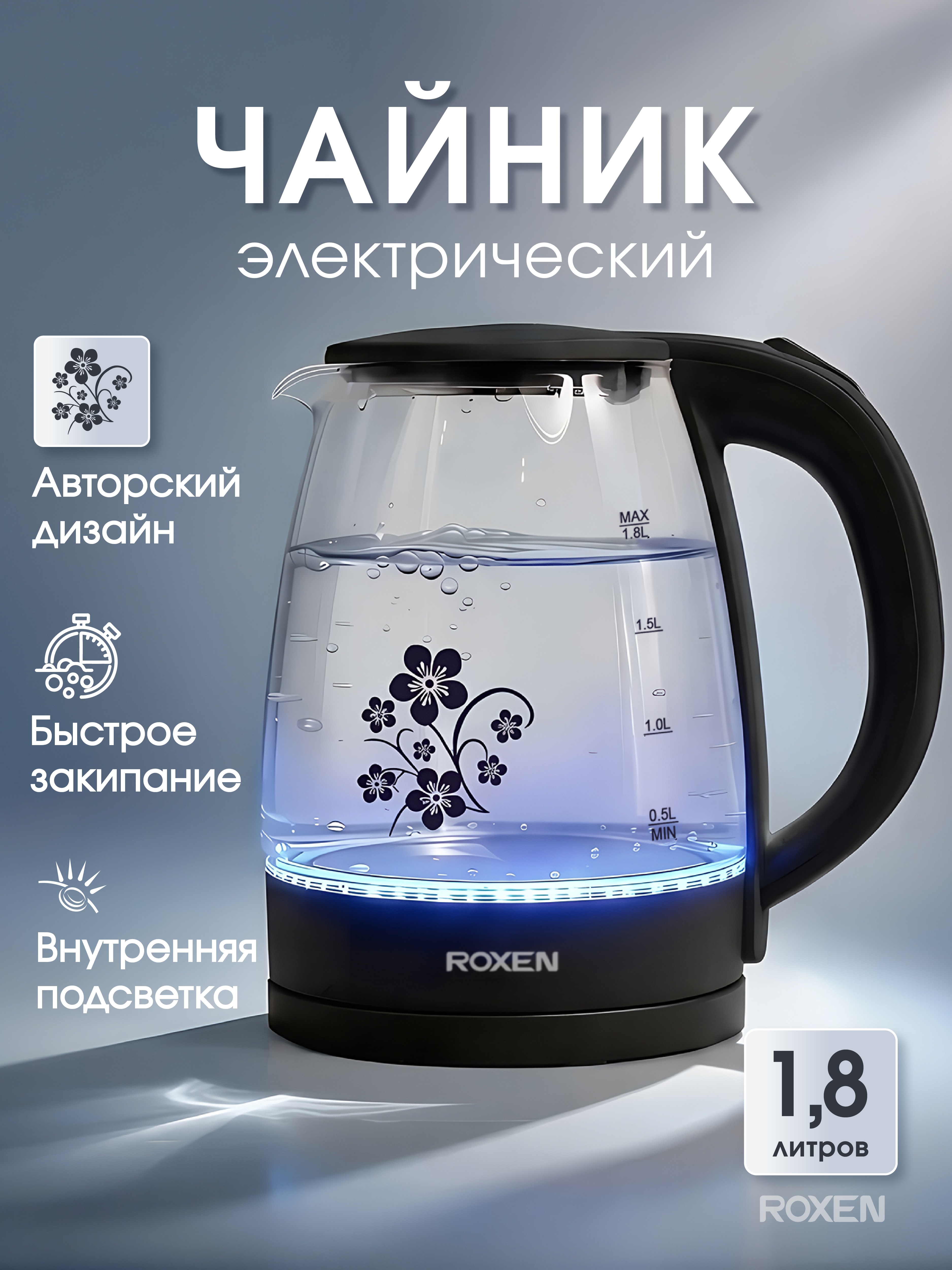 Мощность 1500Вт.Объем 1,8л.Автоотключение при закипании.Возможность поворота на подставке на 360*.Закрытый нагревательный элемент из нержавеющей стали.Световой индикатор работы, корпус из термостойкого стекла, подсветка (12)