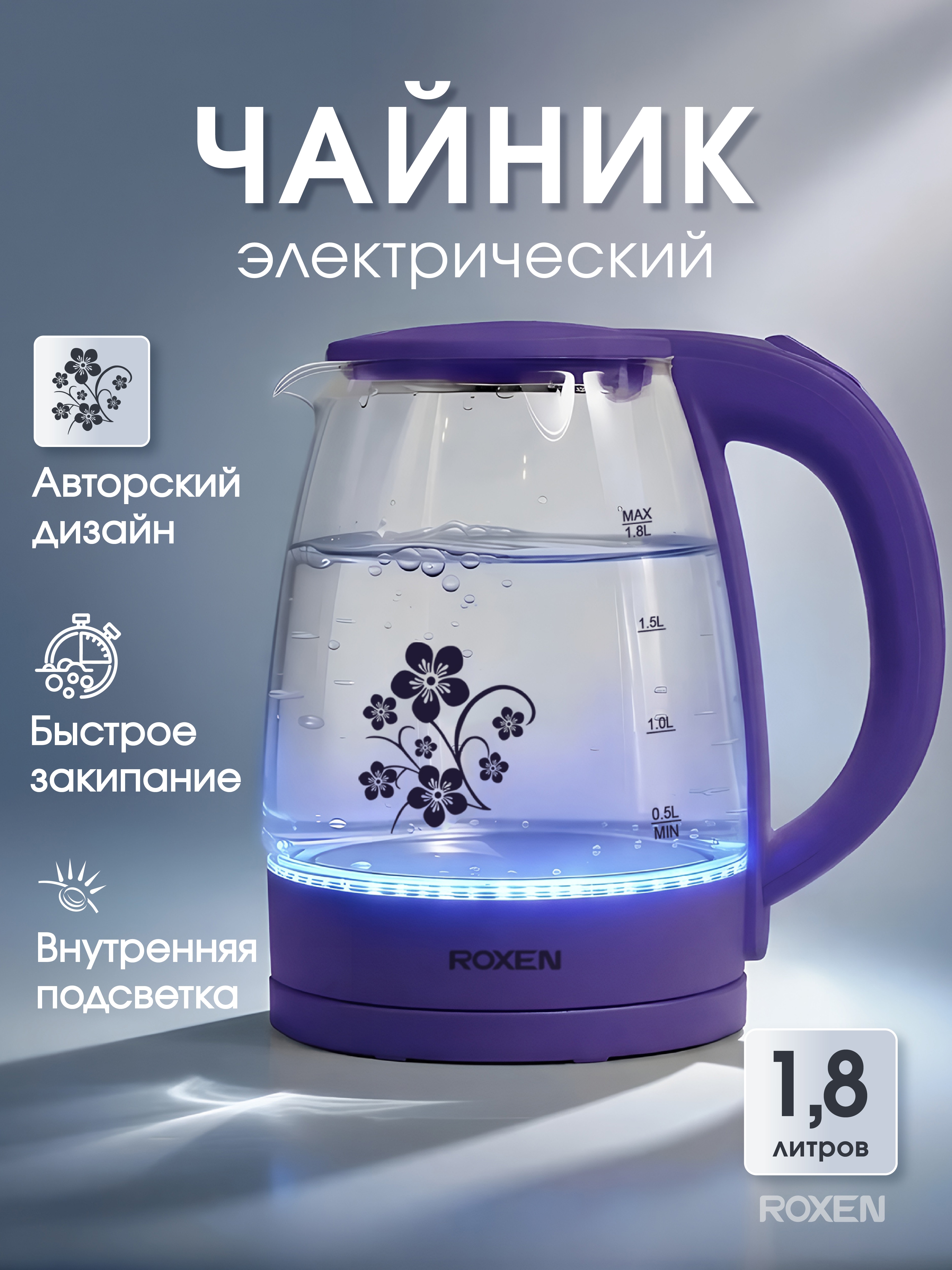 Мощность 1500Вт.Объем 1,8л.Автоотключение при закипании.Возможность поворота на подставке на 360*.Закрытый нагревательный элемент из нержавеющей стали.Световой индикатор работы, корпус из термостойкого стекла, подсветка (12)