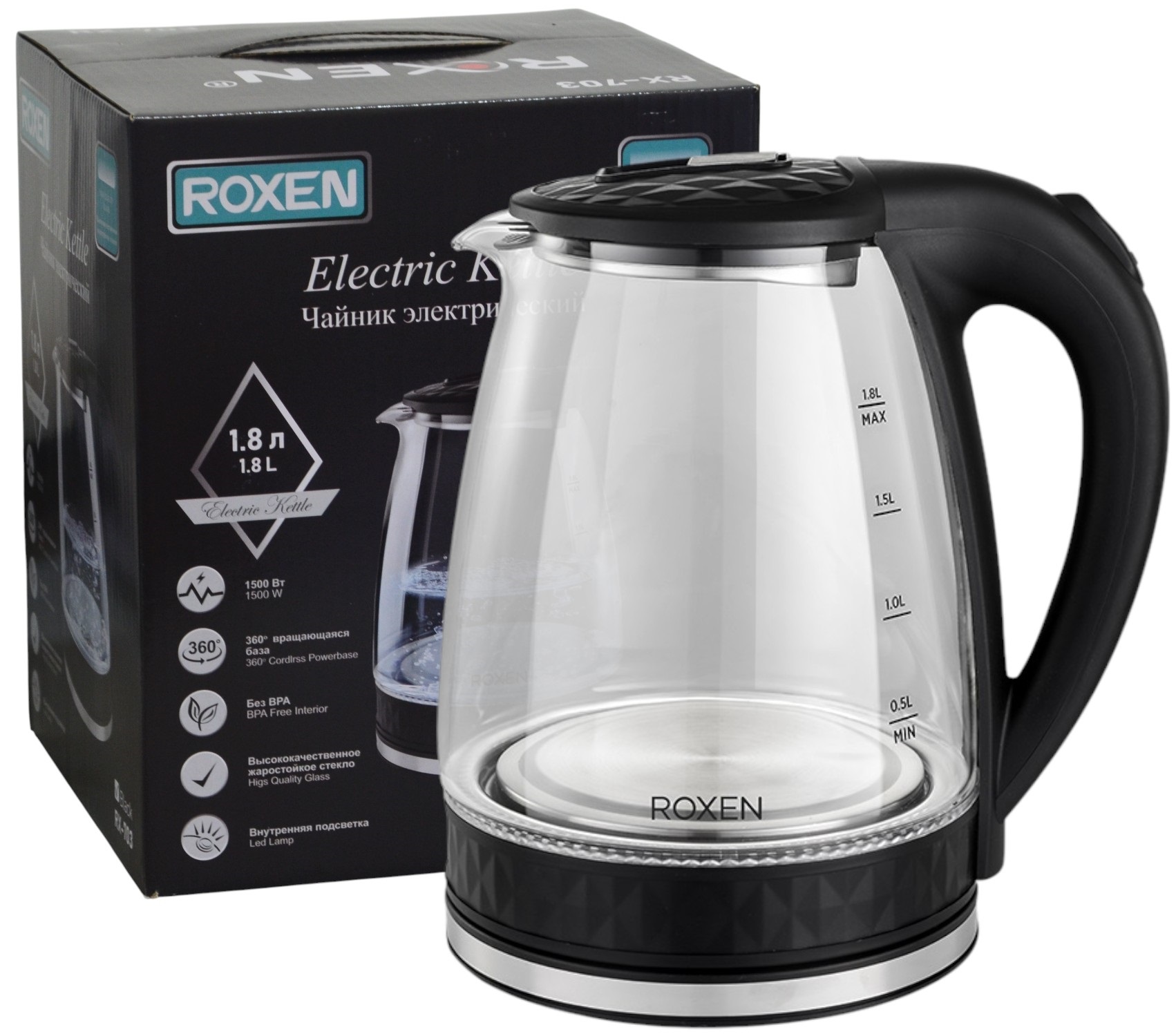 Мощность 1500Вт.Объем 1,8л.Корпус термостойкое стекло.Автоотключение при закипании.Возможность поворота на подставке на 360*.Закрытый нагревательный элемент из нержавеющей стали.Световой индикатор работы (12)
