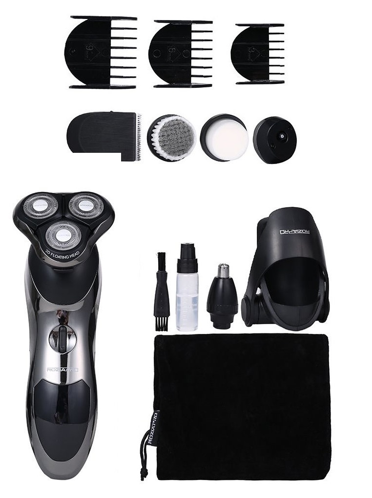 Мощность 5Вт.Аккумулятор.Время работы 60 мин,зарядки 1 час.Роторные головки.Влажное/сухое бритье.8 функций : триммер для носа,машинка для стрижки(3 насадки),2 массажные щеточки,бритва,выдвижной триммер,подвижный бритвенный блок.подставка,чехол для аксессуаров.
