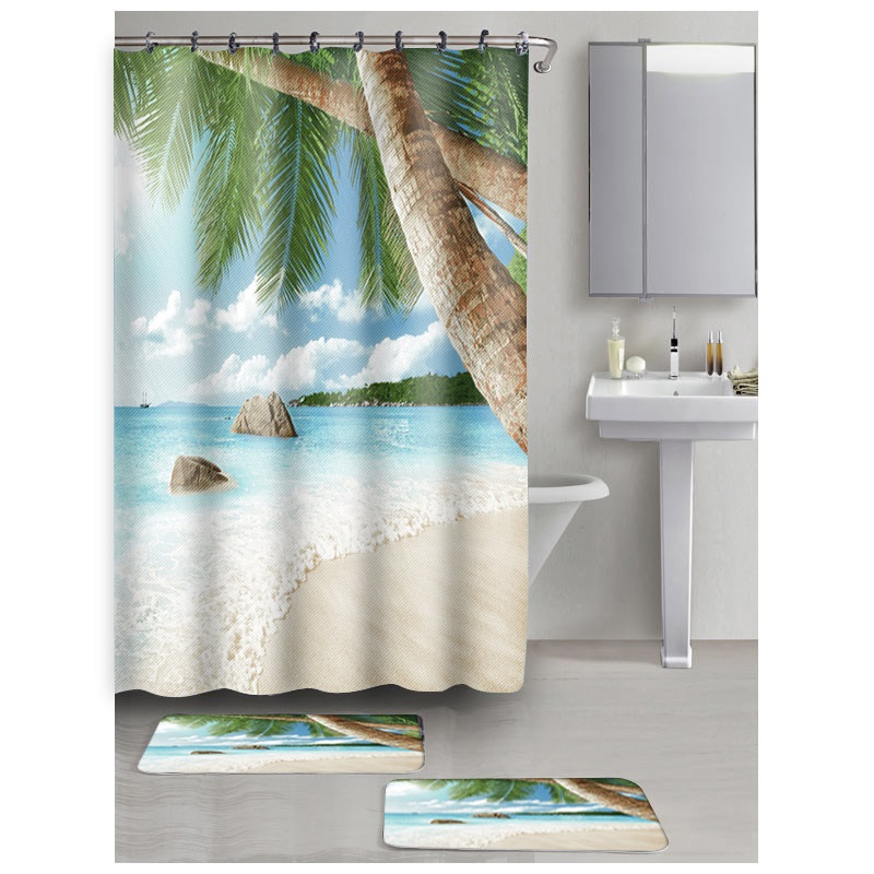 Набор из 3-х предметов для ванной комнаты "Пляж" (2 коврика, 1 занавеска).Размер ковриков 42,5*60см и 45*68см,занавески 180*180см в комплекте с 12 крючками,декорированными тканью.Занавеска 100% полиэстер, 50г/м2 (6)
