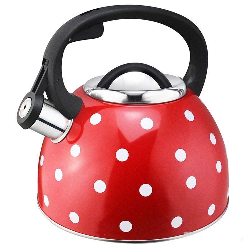 Чайник из нерж стали со свистком Maestria 2,5л (красн в бел горошек) со свистком с крышкой,с ручкой из нейлона,матовый внутри/окрашенный-снаружи,красный в белый горошек. дно -одинарное,подходит для всех типов плит,толщина стали - 0,35мм,глянцевая окрашенная поверхность корпуса.Упаковка-цветная коробка.Модель-Maestria.Материалы нержавеющая сталь,нейлон.
