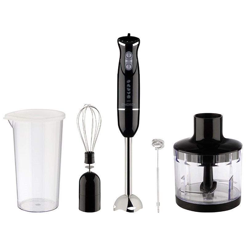 Мощность 600Вт.2 скорости.Turbo режим.Регулятор скорости.Ножи из нержавеющей стали.Металлическая насадка блендер.Стакан для смешивания 600мл с крышкой.Измельчитель 400мл.Венчик.Вспениватель молока (6)