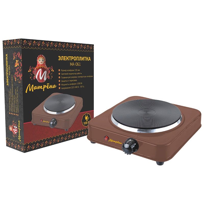 Электроплита Матрёна МА-061 коричневый, блин.Мощность 1000Вт. Размер конфорки 155мм.Защита от перегрева.