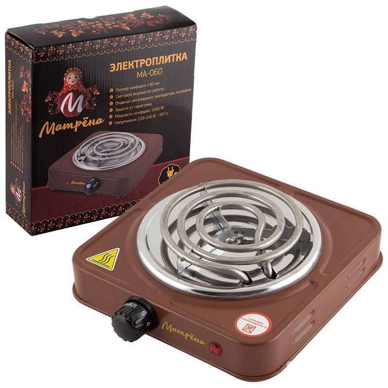 Электроплита Матрёна МА-060 коричневый ТЭН.Мощность 1000Вт.Размер конфорки 140мм.Световой индикатор работы.Плавная регулировка температуры конфорки.Защита от перегрева