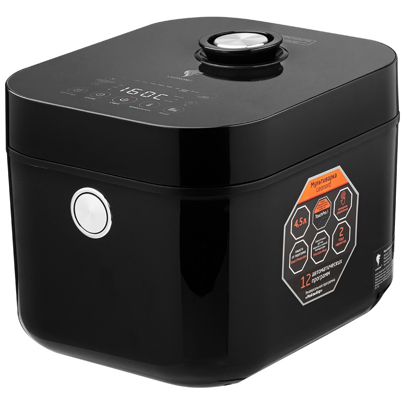 Мощность 860Вт.Обьем 4,5л.Чаша с антипригарным покрытием Touch Pro 5.Сенсорное управление.LED дисплей.12 программ приготовления.Датчик Precision Heat верхней и нижней температуры.Съемная внутренняя крышка для удобной чистки.Система защиты от перегрева Smart Protection.В комплекте: контейнер-пароварка, мерный стакан, лопатка и ложка.Длина шнура 120см (2)