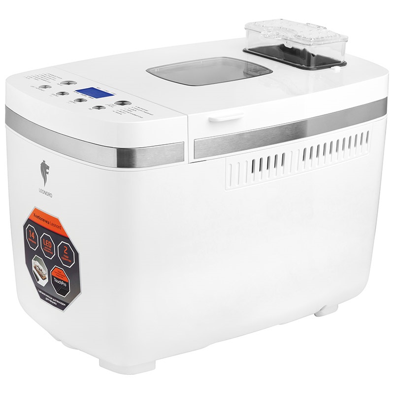 Хлебопечка Leonord LE-1738.Мощность 850Вт.Размер буханки 900/1150/1350г.3 варианта корочки: светлая, средняя, темная.Чаша с антипригарным покрытием TouchPro.Окно для наблюдения за процессом приготовления.LED дисплей с подсветкой.Автоматический диспенсер для начинки.Защита от перегрева.13-часовой таймер отсрочки старта.Функция памяти 10 минут.Автоматическое поддержание температуры в течение 1 часа.2 лопатки для замешивания.В комплекте: мерный стаканчик, мерная ложка, крючок 14 программ приготовления: 1. Белый хлеб(Основной) 2. Быстрый хлеб 3. Французский хлеб 4. Сверхбыстрый 5. Цельнозерновой хлеб 6. Кекс/Пирог 7. Тето 8. Выпекание 9. Хлеб для сэндвичей 10. Джем 11. Замес 12. Безглютеновый хлеб 13. Йогурт 14. Пекарь(1)
