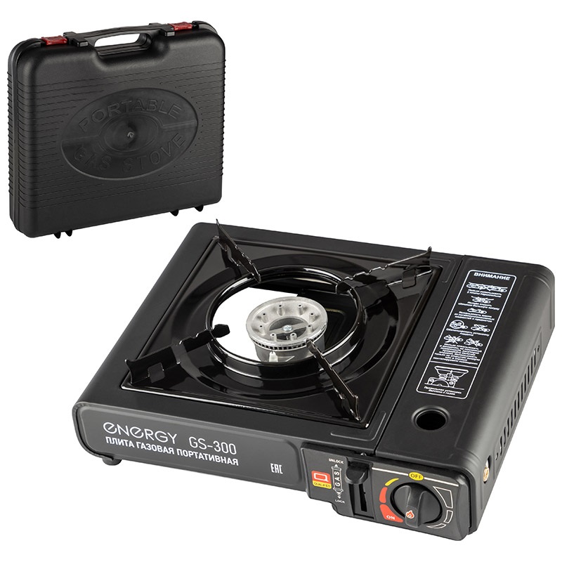 Плита газовая портативная ENERGY GS-300 (2 типа подключения).С пьезоподжигом.В кейсе.С регулятором пламени.Переходник из цинкового сплава и железа с латунным покрытием.Плитка походная.Работает от цангового баллона-картриджа со смесью бутана и пропана (или изобутаном).(Рекомендуемый баллон-картридж арт.105732), так и от бытового газового баллона. защита от утечки газа защита от неправильной установки баллона двойная изоляция клапана подачи газа защита от подачи газа повышенного давления.Размеры (в кейсе) 350*300*95мм.Размеры вне кейса 340*280*115мм.Мощность 8000BTU (2,5 кВт).Температура до +700°C.Расход газа до 155г/час.Кейс в подарок! (6)