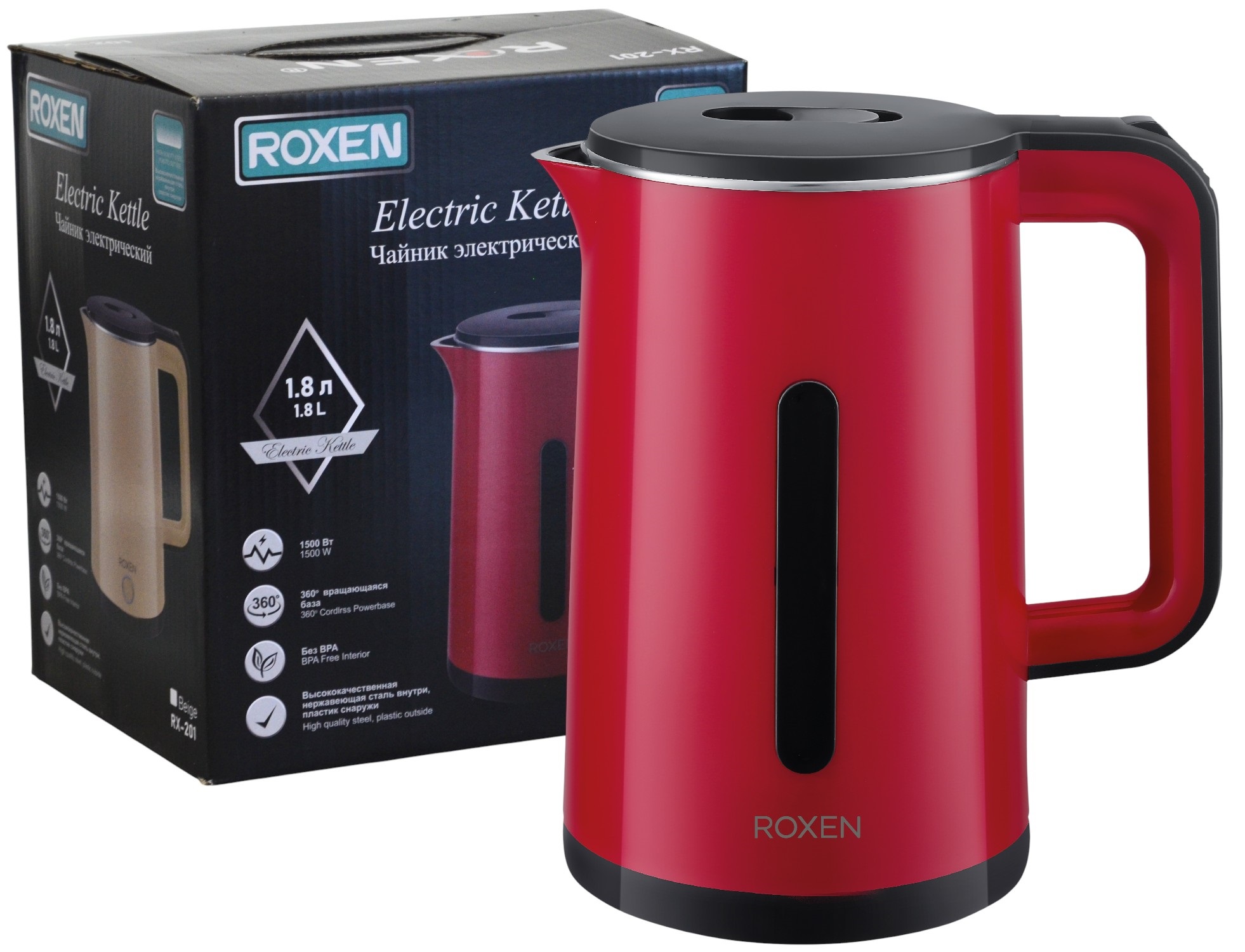 Мощность 1500Вт.Объем 1,8л.Двойной корпус пластик/сталь.Автоматическое отключение при закипании.Возможность поворота на 360 градусов (12)
