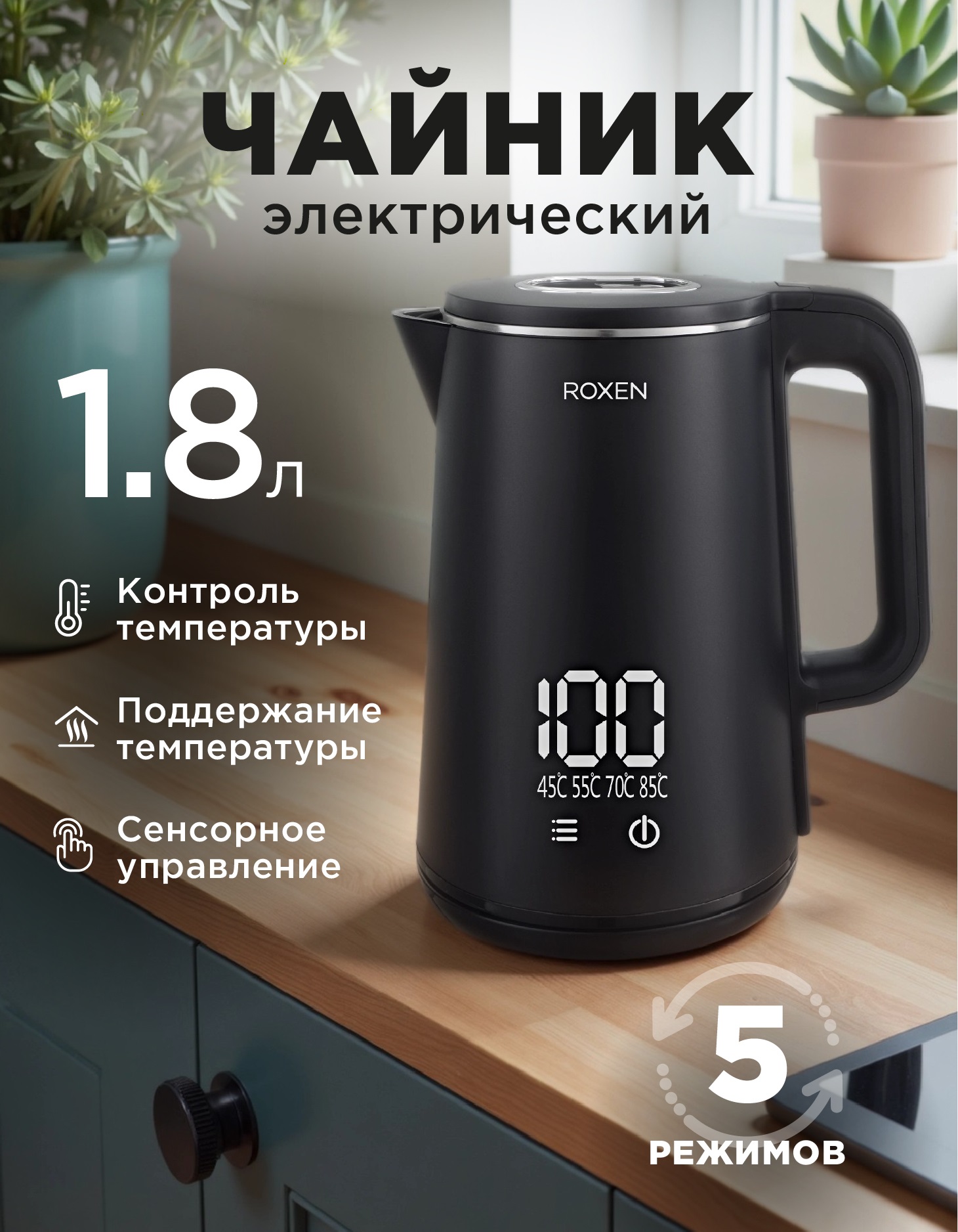 Мощность 1500Вт.Объем 1,8л.Двойной корпус пластик/сталь.5 режимов нагрева.Сенсорное управление.Автоотключение при закипании.Возможность поворота на подставке на 360* (12)