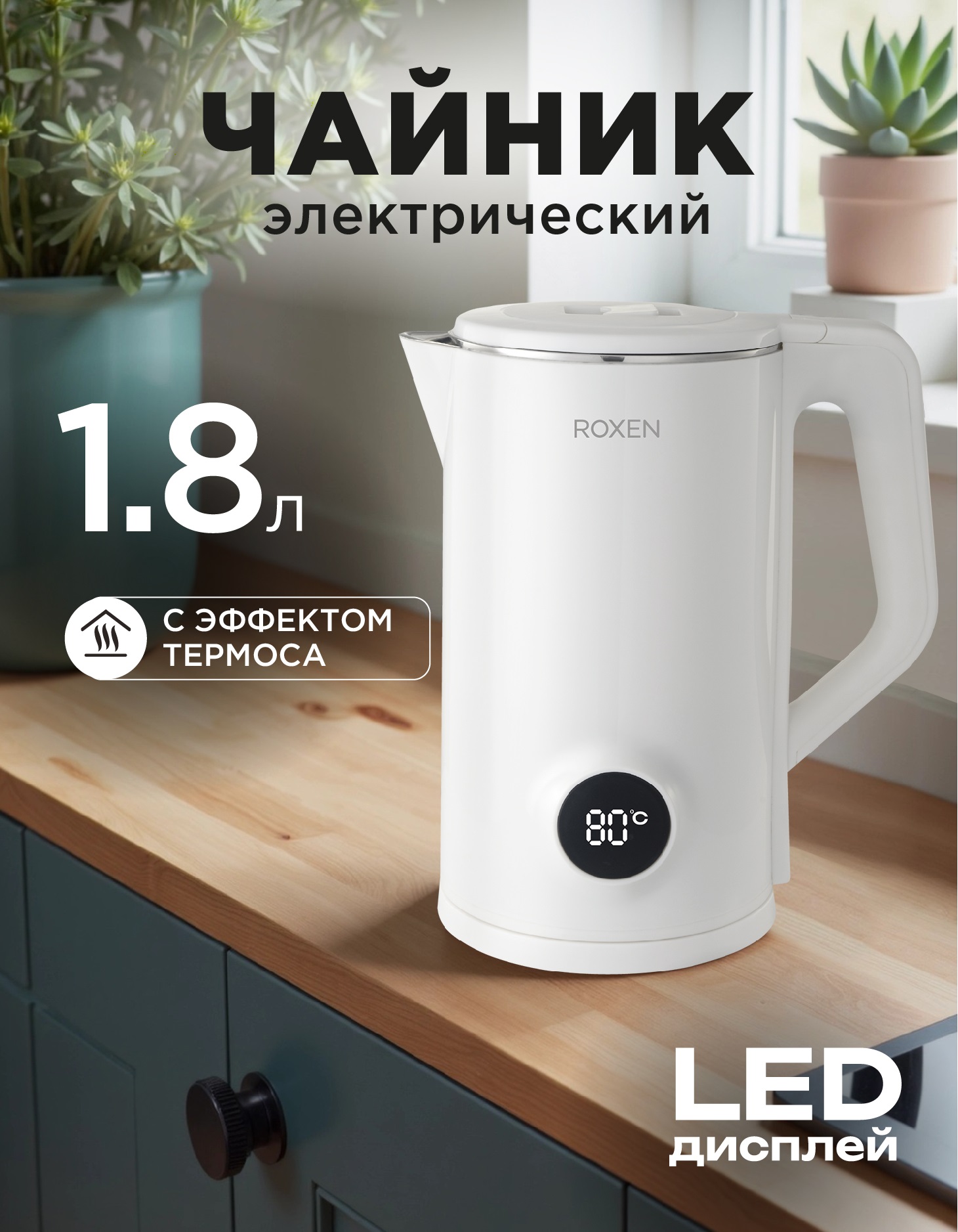 Мощность 1500Вт.Объем 1,8л.Двойной корпус пластик/сталь.Индикатор температуры.Автоотключение при закипании.Возможность поворота на подставке на 360* (12)