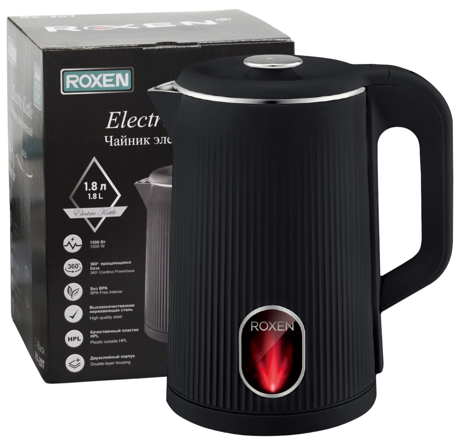 Мощность 1500Вт.Объем 1,8л.Двойной корпус пластик/сталь.Автоматическое отключение при закипании.Возможность поворота на 360 градусов (12)