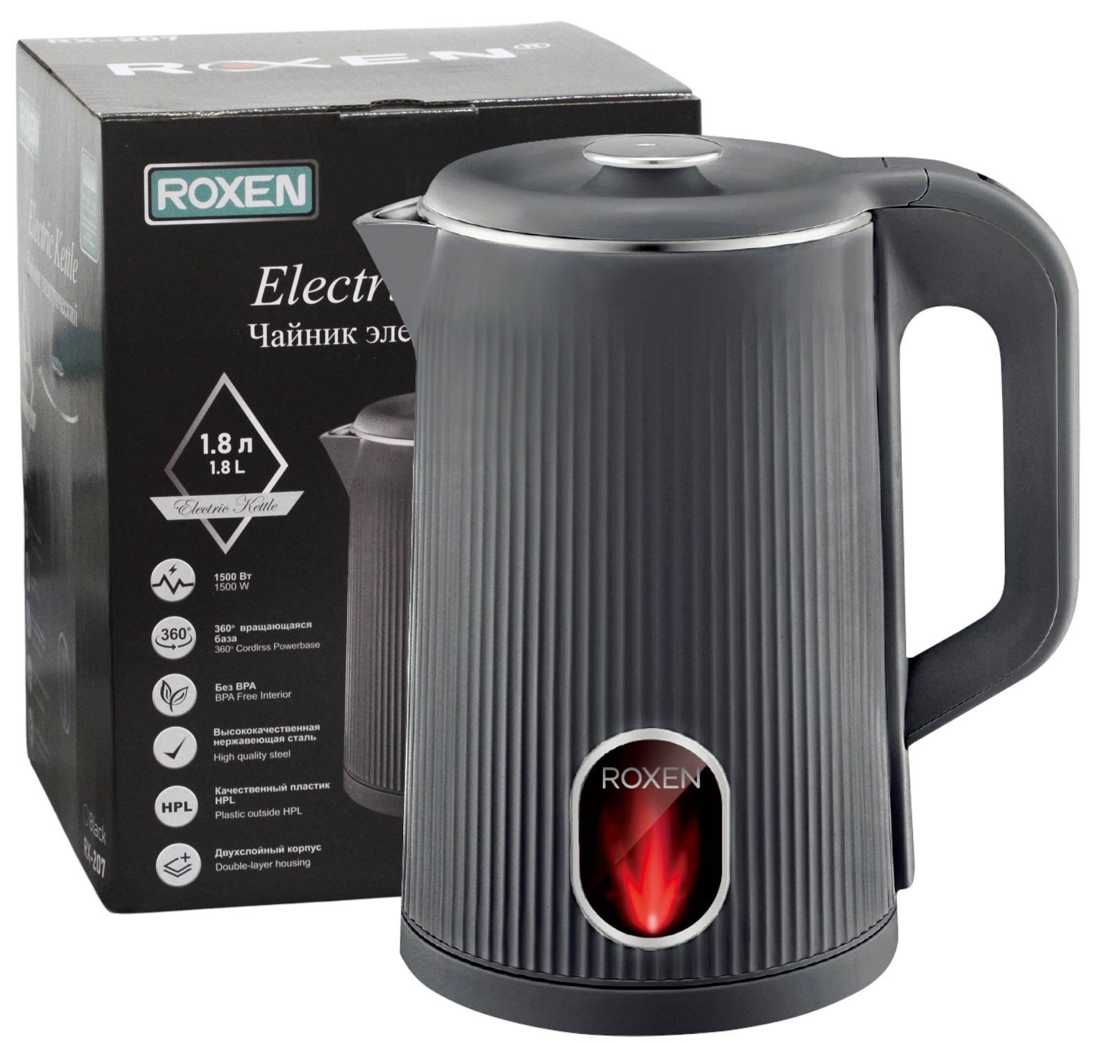 Мощность 1500Вт.Объем 1,8л.Двойной корпус пластик/сталь.Автоматическое отключение при закипании.Возможность поворота на 360 градусов (12)
